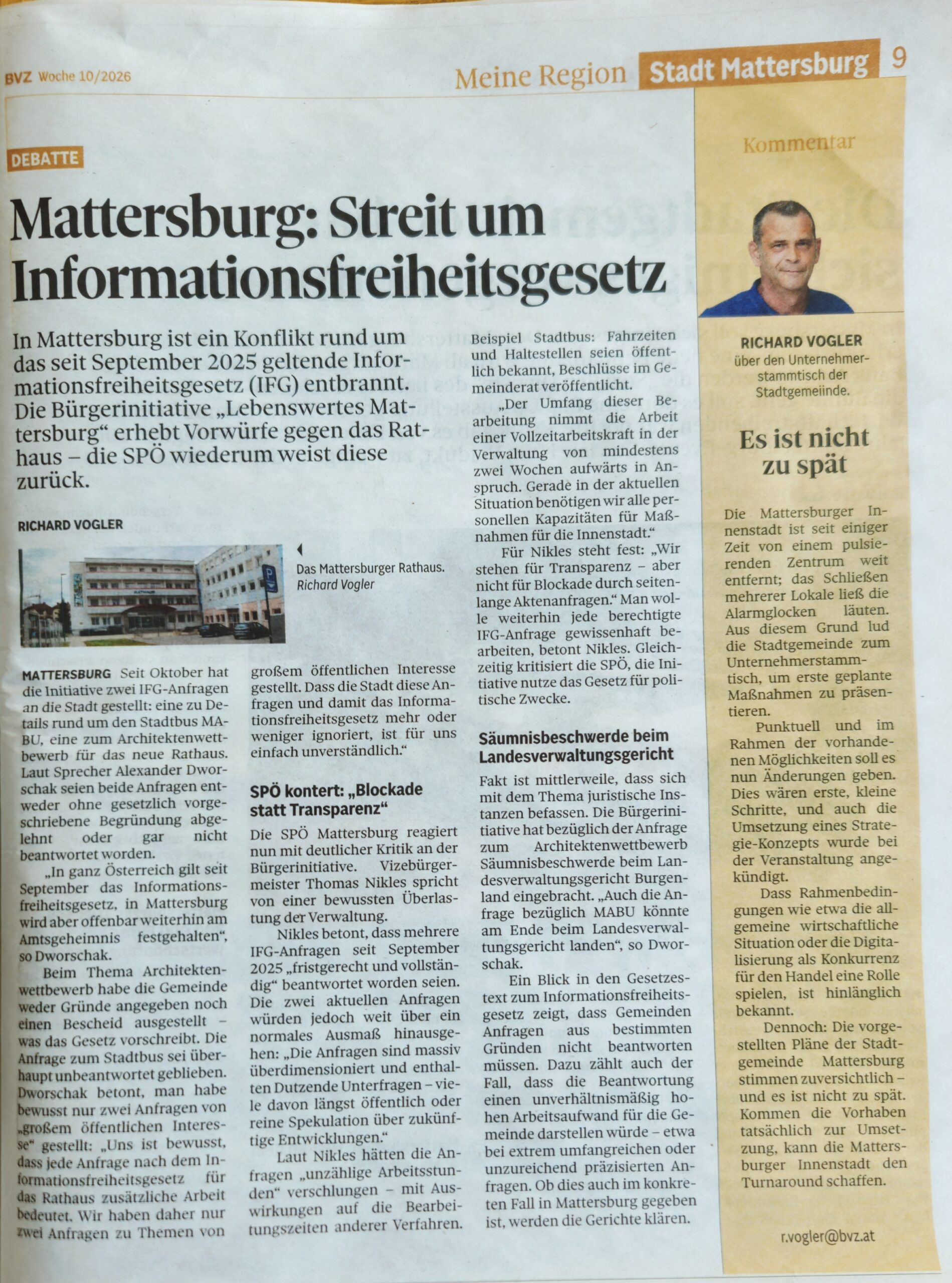In der BVZ (Ausgabe 10/26 vom 5.3.2026, den Link findet ihr hier) läßt der Mattersburger Vizebürgermeister Thomas Nikles (SPÖ) den Eindruck entstehen, die Stadt könnte es sich aussuchen, ob sie sich an Fristen und Verfahrensvorschriften im Informationsfreiheitsgsetz hält oder nicht. Absicht, Missverständnis oder Irrtum? Wir haben ihm einen Offenen Brief geschrieben, den findet ihr hier.