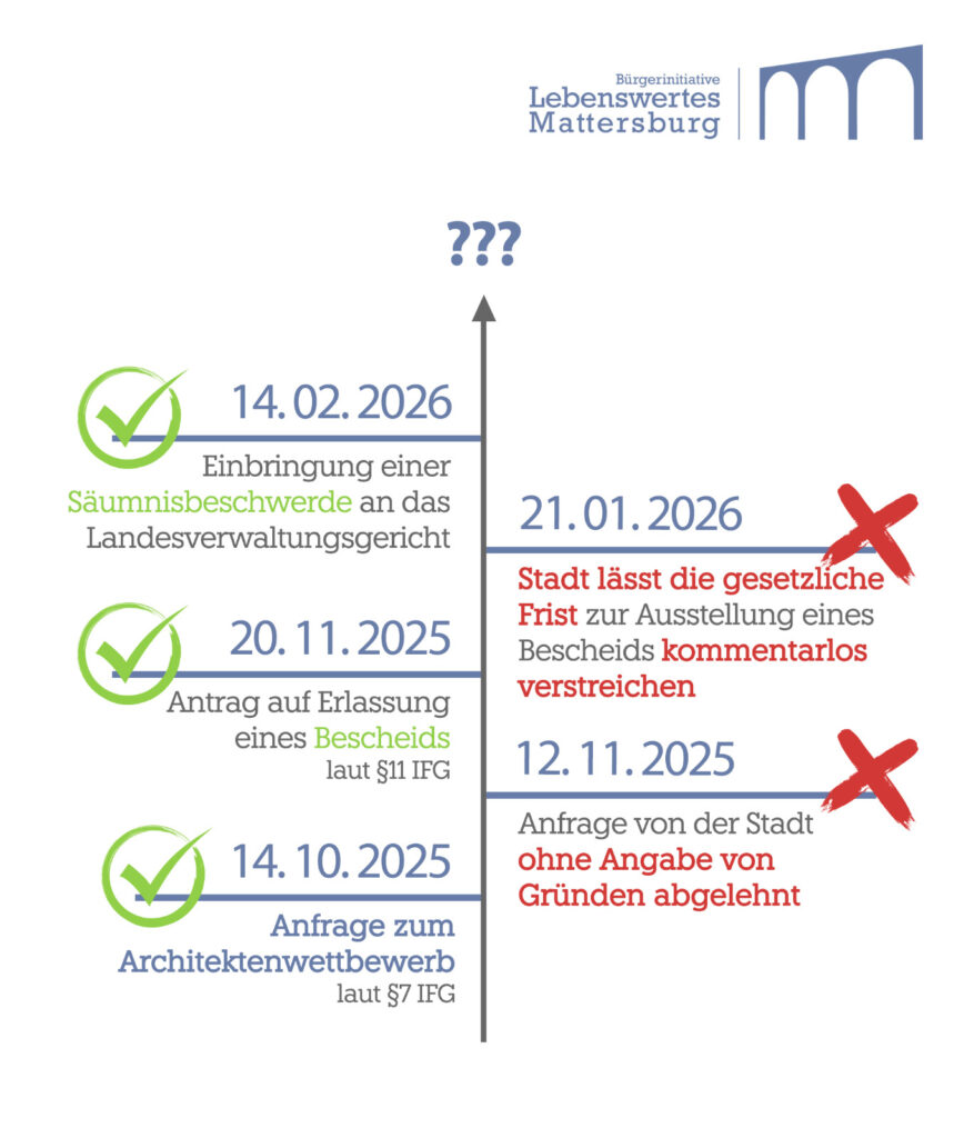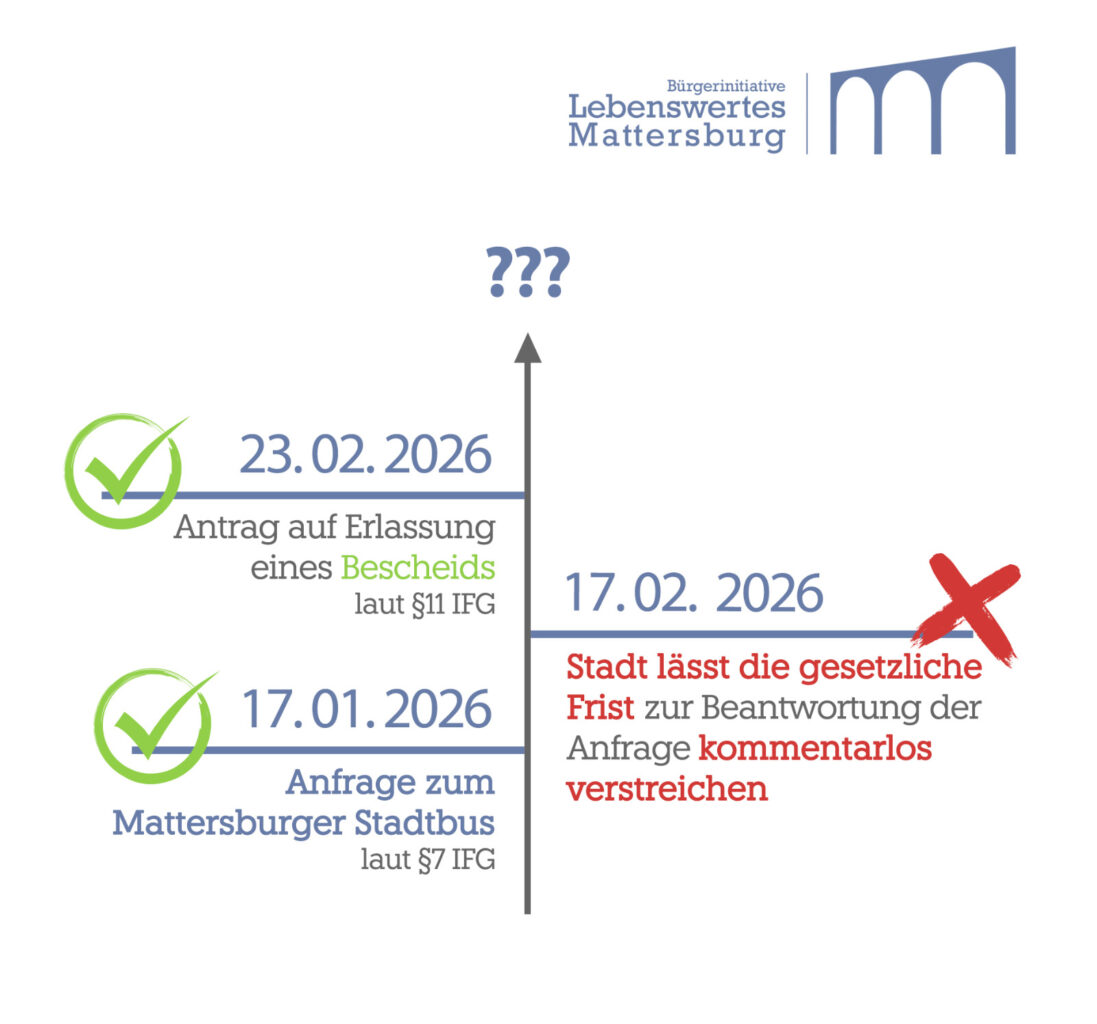 Seit Oktober 2025 hat die Bürgerinitiative „Lebenswertes Mattersburg“ zwei Anfragen nach dem neuen Informationsfreiheitsgesetz IFG an die Stadt Mattersburg gestellt. Zu zwei Themen, die Viele in der Stadt interessieren: zum Mattersburger Stadtbus und zum Architektenwettbewerb für ein neues Rathaus. In beiden Fällen hat die Stadt die Auskunft verweigert bzw. die Vorgaben des Informationsfreiheitsgesetzes einfach ignoriert.